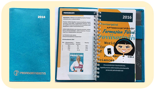 Kuluvan vuoden kalenterin mukaisesti proviisorikalenteri sisältää erillisen pienoiskalenterin, josta löydät tietoa mm. alan koulutustapahtumista, tärkeistä päivämääristä ja jäseneduistasi kootusti kätevässä taskukoossa. Kalenteri toteutetaan yhteistyössä  Accord Healthcaren kanssa.